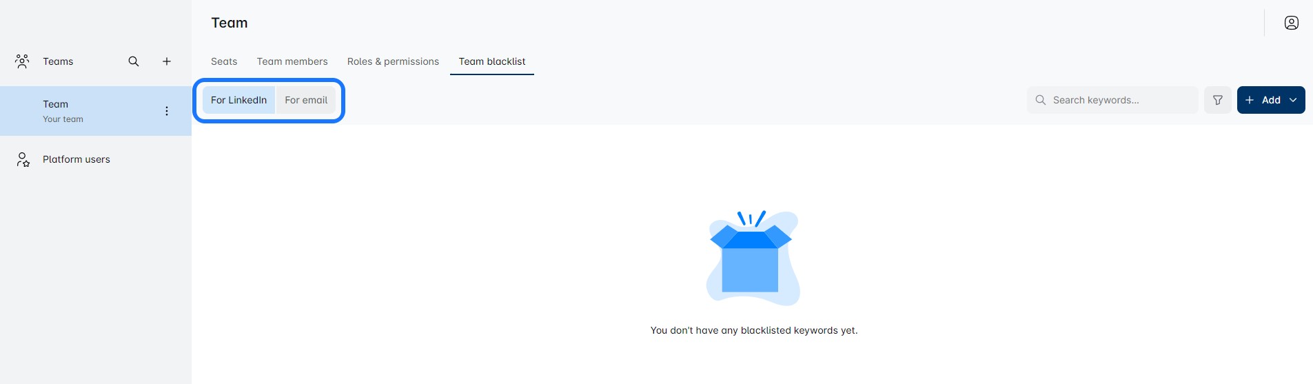 A new page will open and you can select Blacklist for LinkedIn or for email: