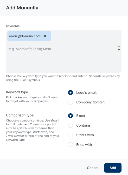 Type the email or company domain here, use Enter to separate the values, and choose the corresponding type (Lead's email or Company domain, depending on what you have written down) Choose your comparison type and click Add to Blacklist.